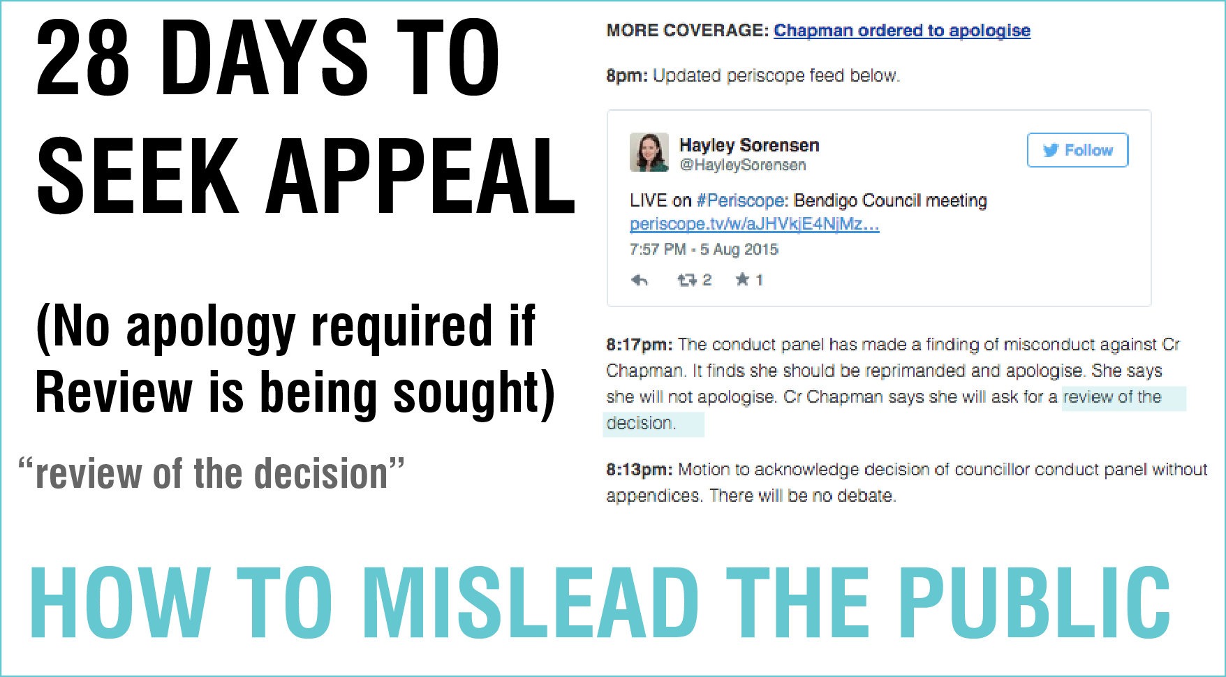 Step 3—KILL the credibility of the Councillor by asking for an apology when a review of the panel’s decision is being sought by the Councillor in question. (The review period to seek an appeal against any Conduct Panel decision is 28 days. This council meeting fell within this 28 day review period. Seeking an apology under these circumstances appears mischievous by Mayor Peter Cox.) Remember that he installed a gag order on proceedings which meant that Councillor Chapman was unable to explain this legal position to the media and the public.