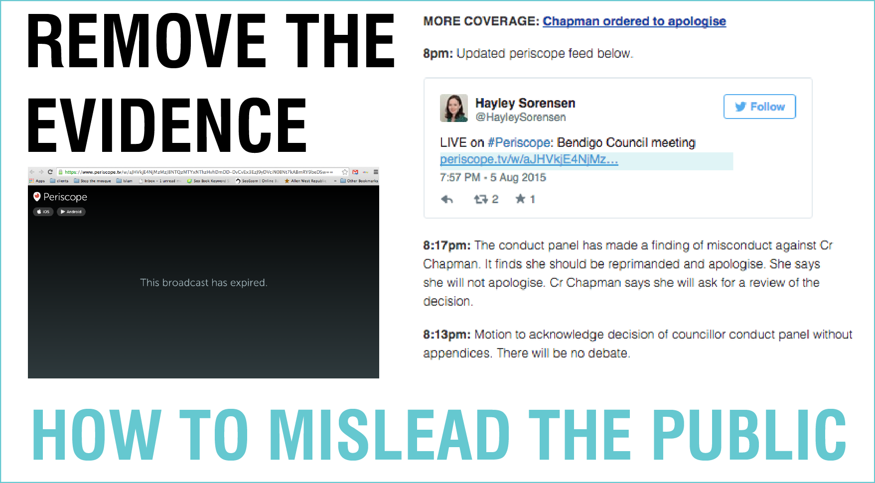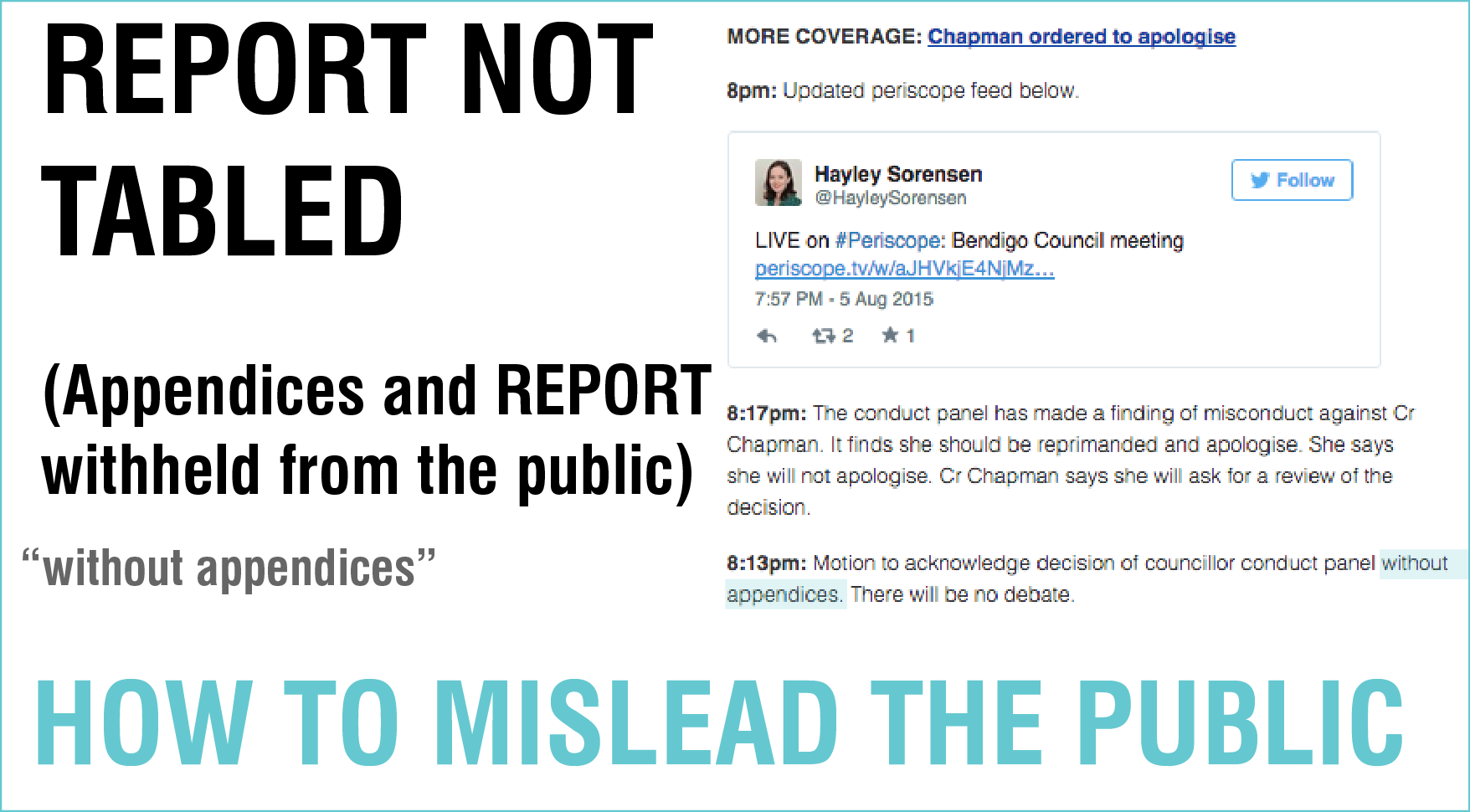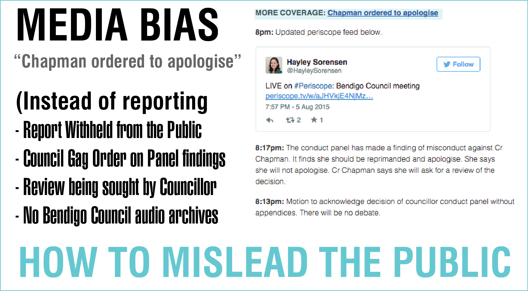 For Example the Bendigo Advertiser could have reported the fact that the Panel Report was being withheld from public—where all previous Conduct Hearing reports for the Bendigo Council have been tabled complete with report and appendices; that the Mayor gagged debate on the conduct Panel Findings and of the report at the meeting; that the Mayor asked for an apology but knew the gag order meant that the Councillor could not respond; that the Bendigo Council is removing the audio trail of its proceedings to prevent future public scrutiny.
