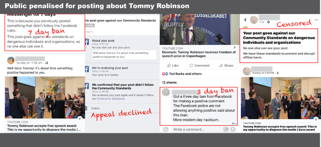 UPDATE: The Presenter was banned by Facebook for sharing the Free Press Awards night that included Tommy Robinson’s acceptance speech. Facebook then went on to ban Danish Members of Parliament for sharing that same Awards night video.