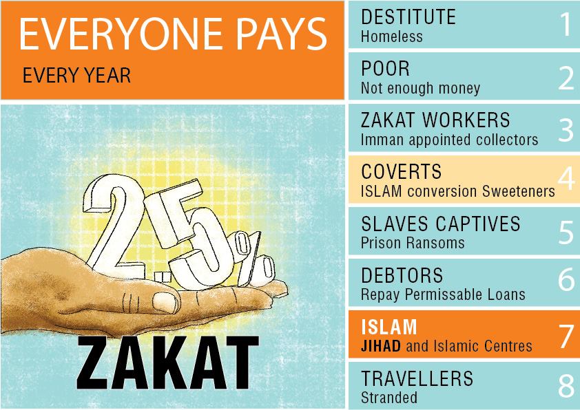 A Muslim must pay a religious tax (Zakat) amounting to 2.5% of TOTAL earnings. Mosques collect and distribute Zakat. One eighth of the contributions ZAKAT is destined to support jihad. In some parts of the Koran the payment to support jihad is actually higher. A true believer is also a person that supports Jihad with their finances. (Chapter 8 Koran) To support jihad is fulfilling a Muslim's religious obligation to Islam. Zakat funds terrorism.