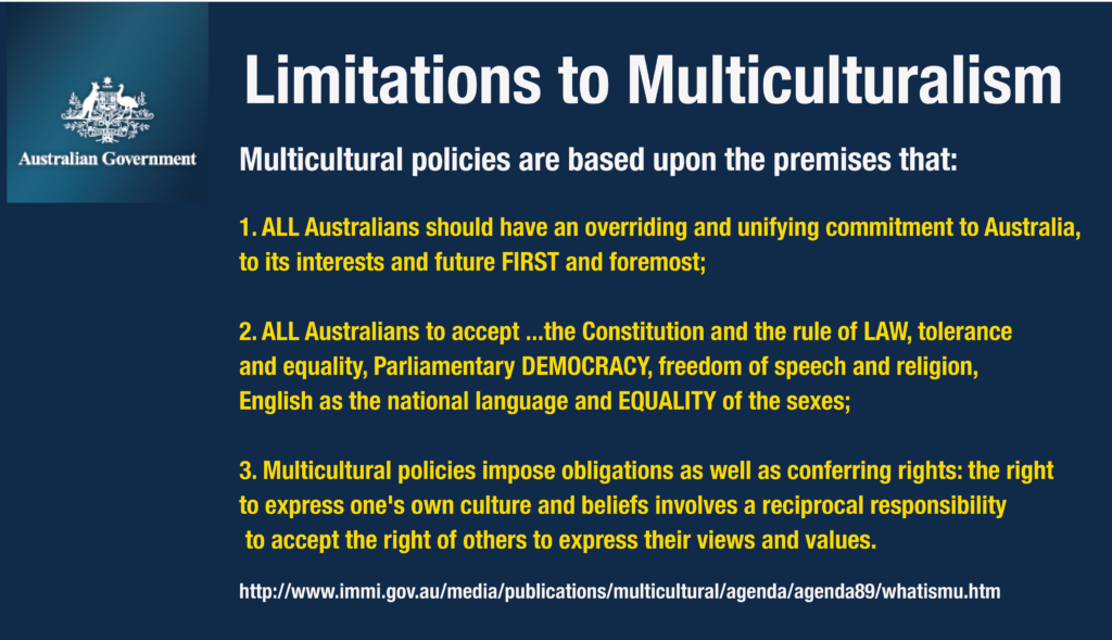 When Multiculturalism was adopted as a policy for Australia three commonsense limitations were placed on the Policy to safeguard Australians from abuse. This documentation was readily available on the Government website up to 2014. However the page can no longer be found. (The link was http://www.immi.gov.au/media/publications/multicultural/agenda/agenda89/whatismu.htm.)